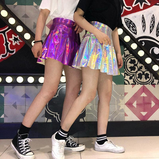 Pleated Skirts Women PU Solid Harajuku Casual Sexy Laser Hight Waist Mini Short Skirt