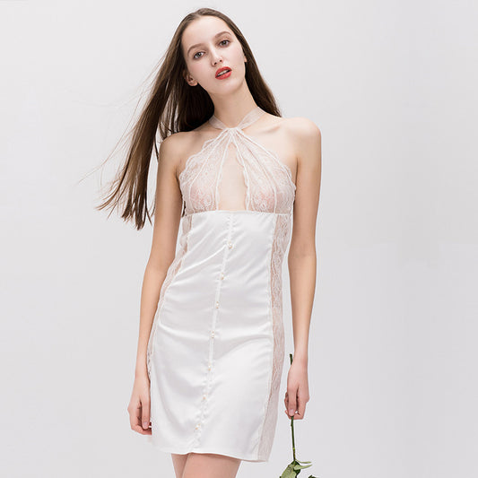 Sexy White Silk Halter Lace See Through Babydoll Nighties