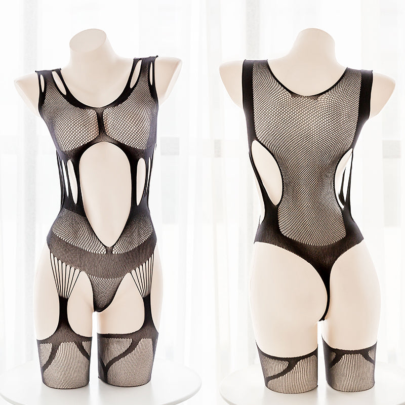Offener schwarzer, durchsichtiger, verführerischer Bondage-Fischnetz-Bodystocking