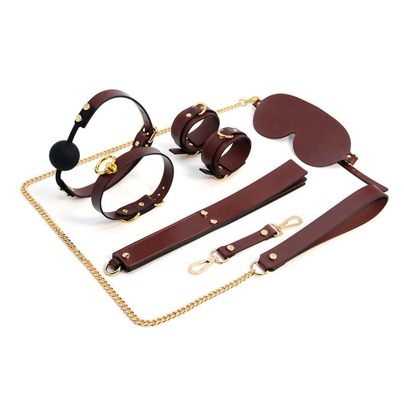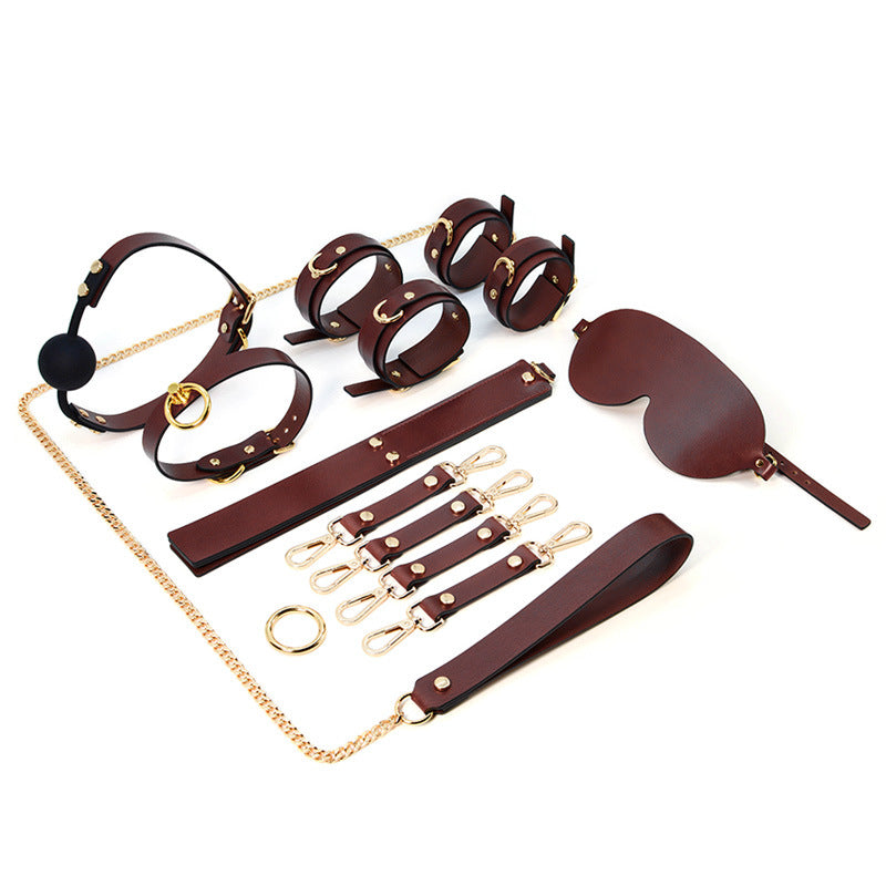 1*Abschleppseil, 1*Halsband, 2*Handschellen, 2*Fesseln, 1*Lederschläger, 1*Kreuzschnalle, 1*Pusteball, 1*Augenmaske
