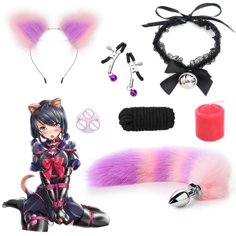 Paket: Schwanz*1, Stirnband*1, Bindeseil*1, Kerze*1, Stopper*1, Halsband*1, Brustclip*1,