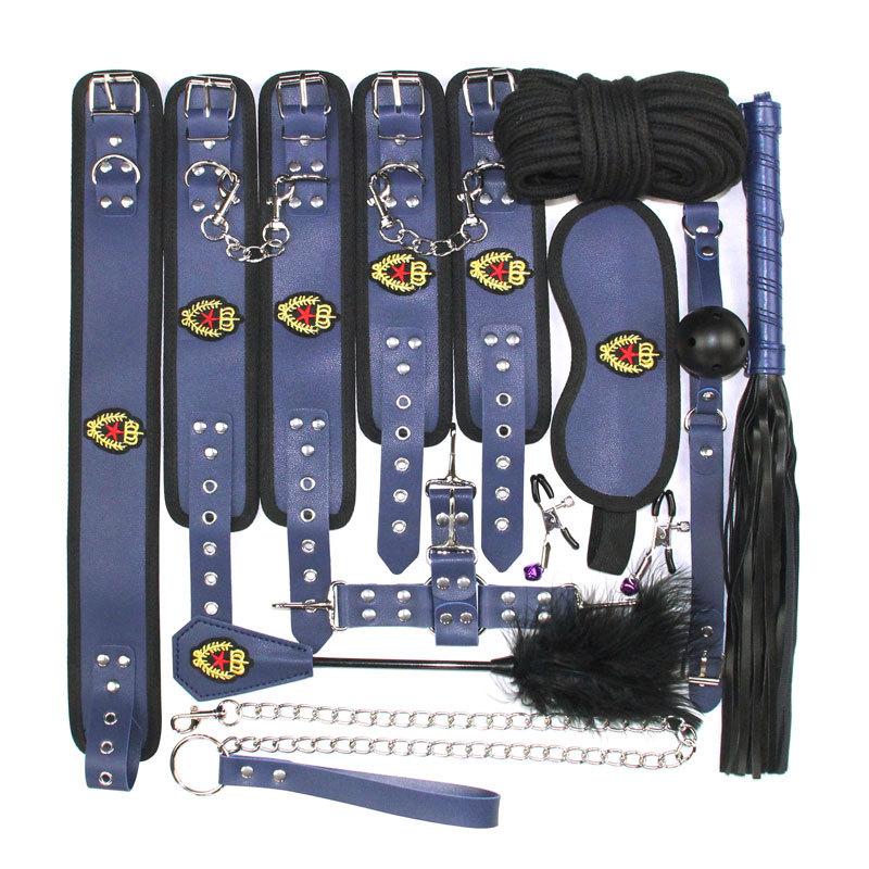 With Leg diamond for slave girls , For Good Master or dom, He will love it. With diamond nipple clamps , BSDM whips, Bondage Paddle, Blindfold, And Ankle Binder And Arm Binder, Pet Collar Inside. That's very awesome pack for BDSM beginners.