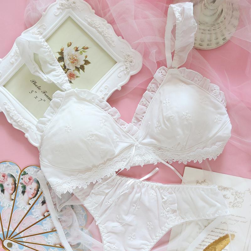 Japanese thin no steel ring Mori style retro embroidery flower triangle cup bra set