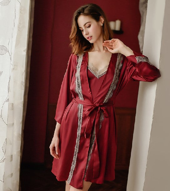 Eyelash Lace New Simulation Silk Sexy Pajamas Long-Sleeved Casual Nightgown