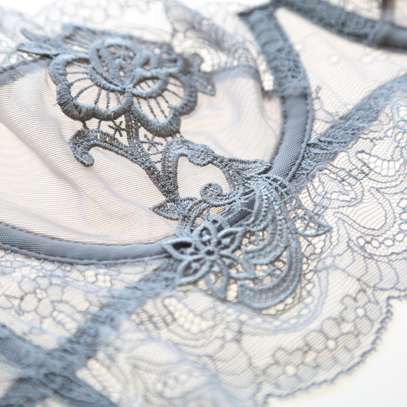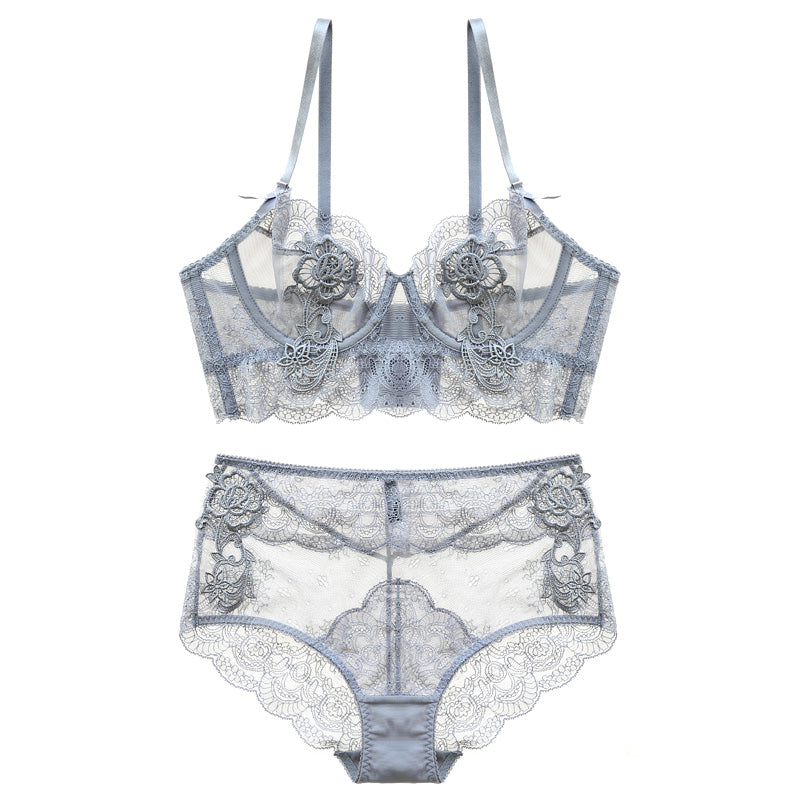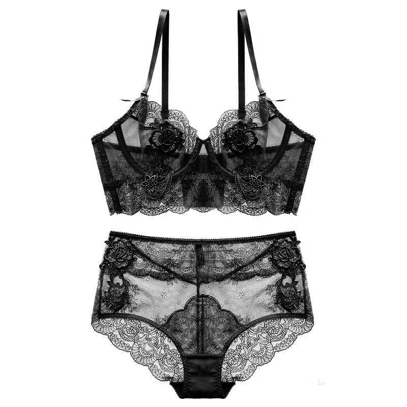 Flower Embroidered Unlined Longline Lace Demi Bra With Free Panty