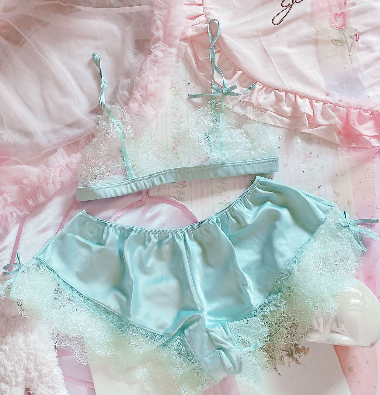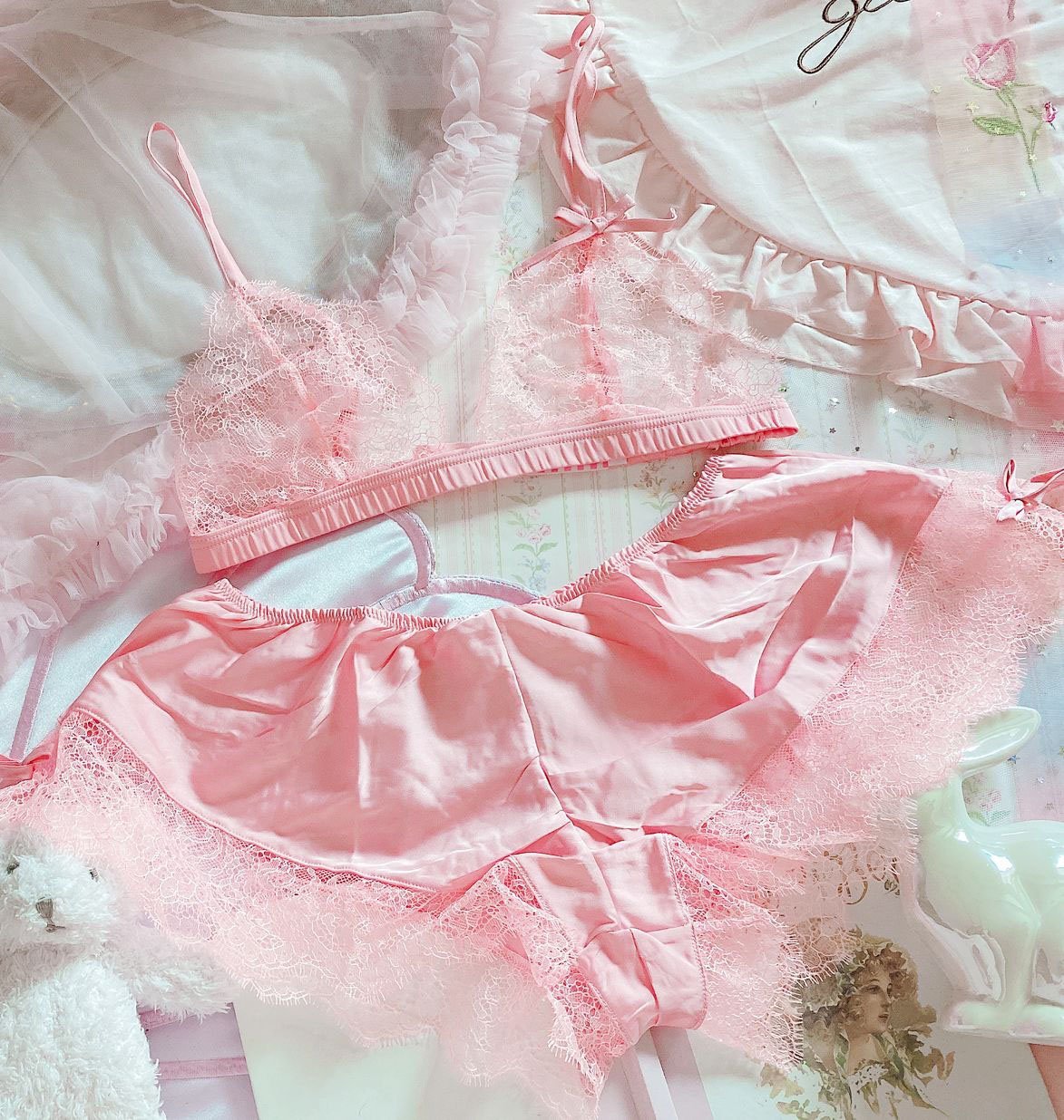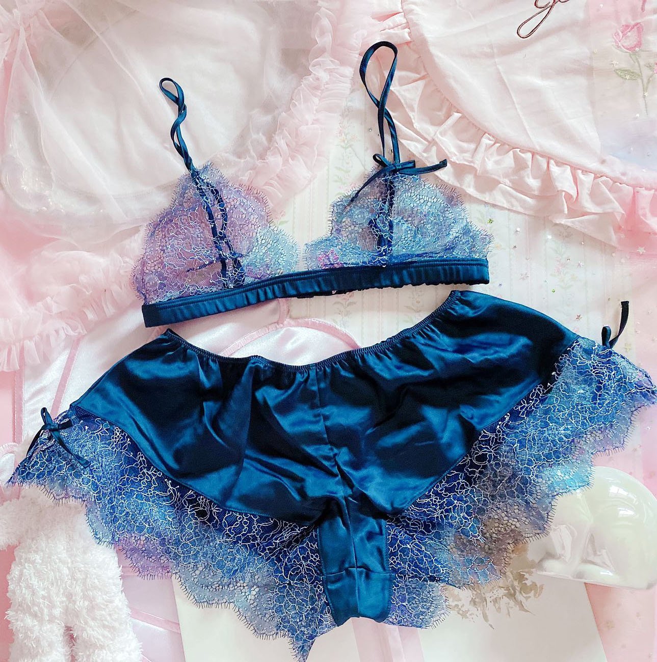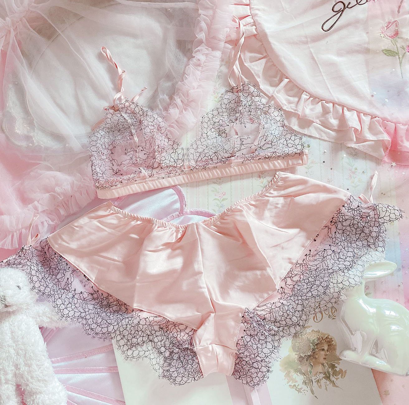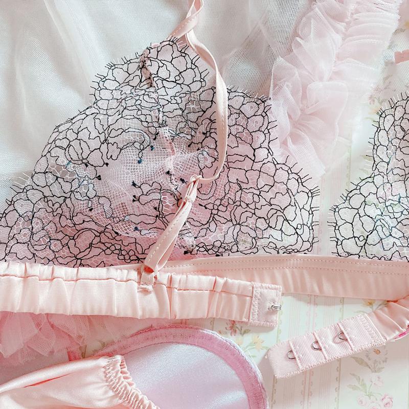 Japanese Girl Eyelash Lace Sexy Steelless Triangle Cup Satin Bra Set