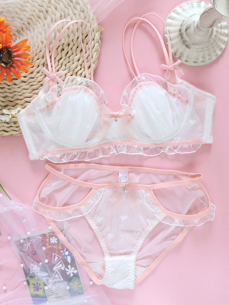Japanese girl white love net yarn sweet and cute bow with steel ring bra set