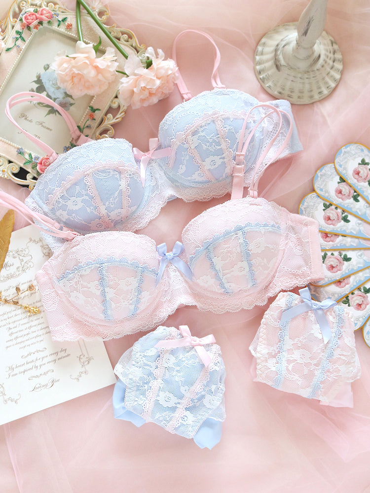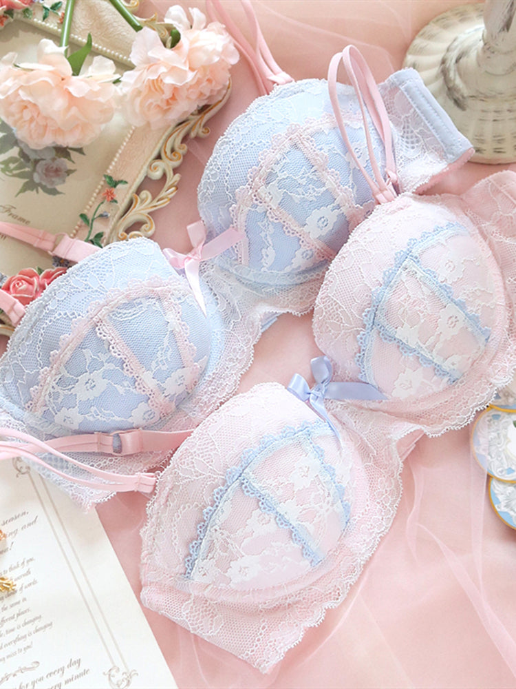 Japanese sweet and cute lace girl heart small fresh and thin bra set with steel ring gathered