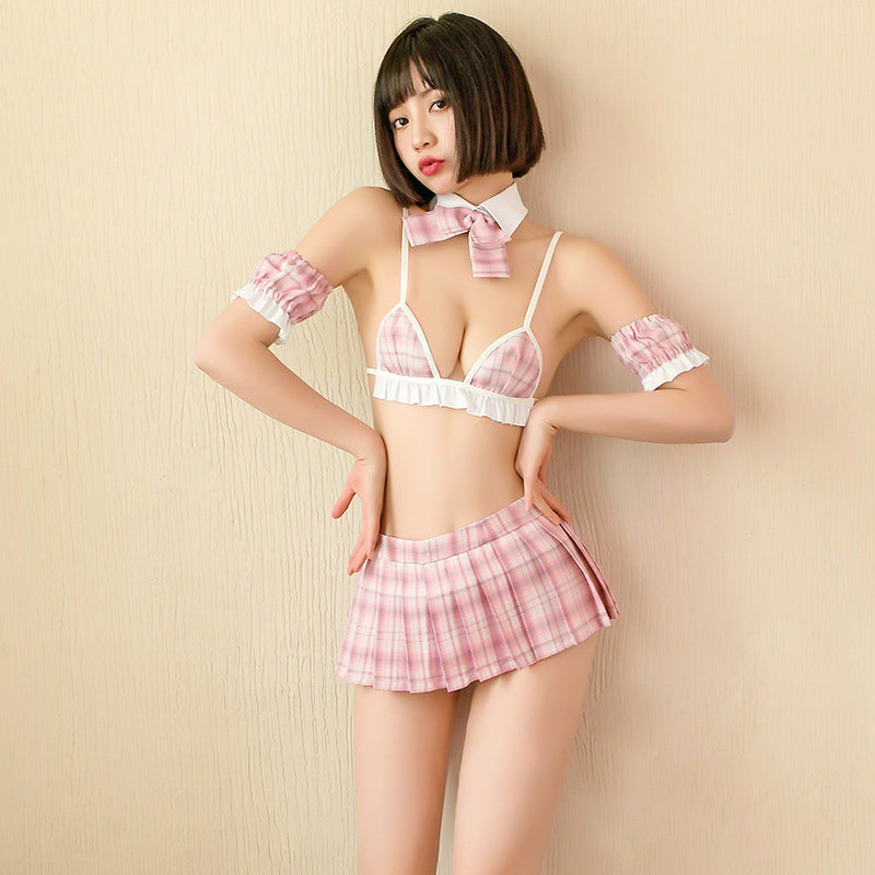 - Package: Bra*1, short skirt*1, T pants*1, bow tie*1, hand sleeves*2